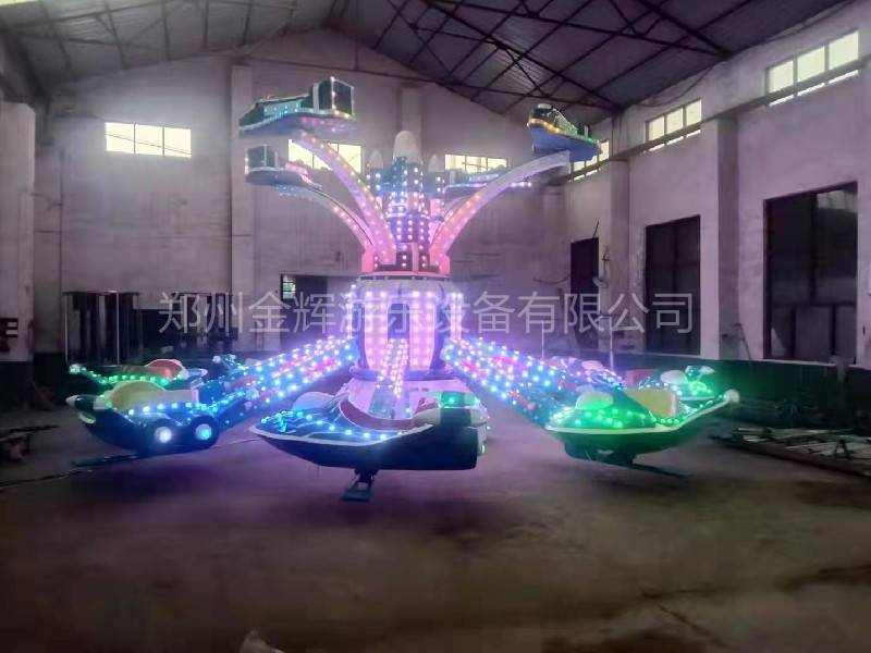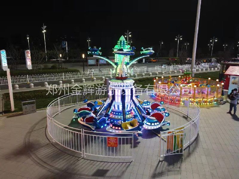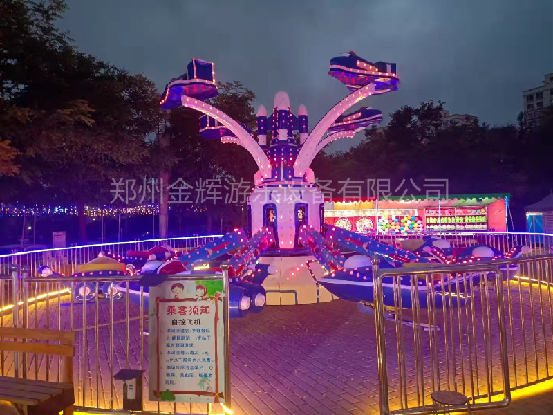 8臂自控飛機(jī)是由機(jī)械、氣動與油壓和電氣系統(tǒng)組成,運(yùn)行特點(diǎn):繞垂直軸中心旋轉(zhuǎn)、升降自由。河南黑獅子游樂設(shè)備生產(chǎn)的8臂自控飛機(jī)性能優(yōu)越,操作簡單。 運(yùn)行時8架飛機(jī)圍繞中心火箭旋轉(zhuǎn),并逐漸上升,游客在飛行中緊握操縱桿隨意升降,互相追逐,令人樂而忘返,新穎的造型、華麗迷人的彩燈裝飾,逼真刺激的空戰(zhàn)音響效果,它具有空云駕之驚險,自由之悠閑,是種游客可自己控制升降的現(xiàn)代游樂設(shè)施。