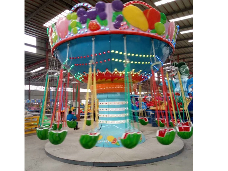 西瓜飛椅是款經(jīng)典的游樂設(shè)備。其靚麗的外表和充滿刺激性的游戲形式很受大家的歡迎。外在的水果西瓜造型色彩鮮艷,栩栩如生更是讓人駐足。該兒童游樂設(shè)備部飛檐和中心柱玻璃鋼均配有彩燈,在夜幕下更是美輪美奐。乘客乘坐在吊椅上能體驗到飛翔的感覺,收獲快樂! 水果飛椅備配有16個精美的西瓜座艙,整體設(shè)計美觀大方,設(shè)備周身配有許多燈光,的提升了設(shè)備的視覺效果和設(shè)備本身的吸引力!
