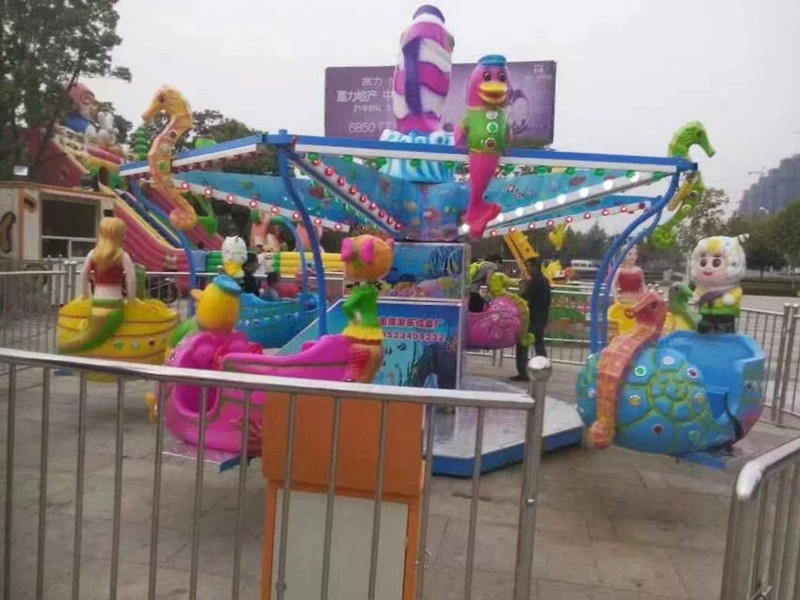 "海洋漫步"是在 桑巴氣球和搖頭飛椅的基礎(chǔ)上 精心改良的款中小型兒童游樂設(shè)備.以神秘的海洋做為背景,又將神秘、 美人魚;人類的好朋友——調(diào)皮的海洋動物,可愛的海螺、海馬、小貝殼等等海洋生物呈現(xiàn)在在家眼前,加上傾斜、起伏的運(yùn)動軌跡設(shè)計(jì),帶著大家漫步在海洋之中,以美人魚為友,感覺著海洋的無窮魅力和擋不住的吸引力。